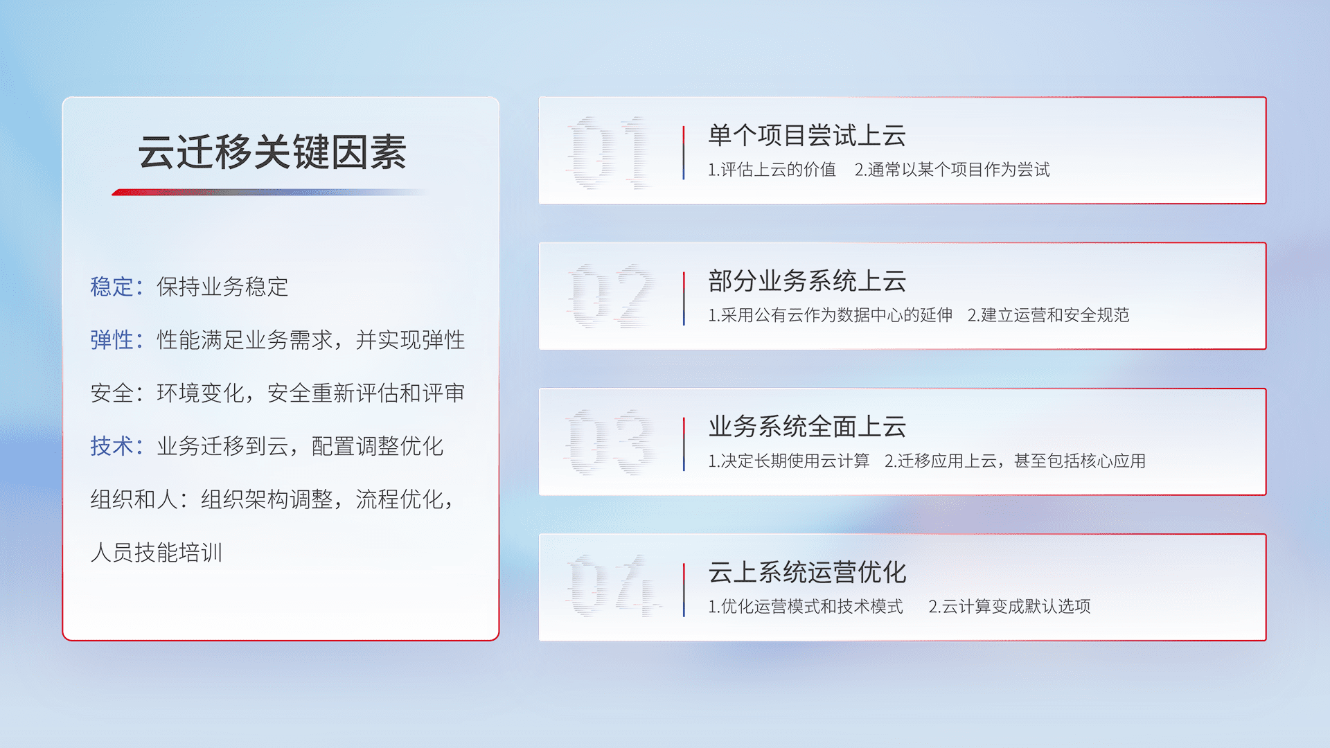 结合实际业务,,从规划设计、、云平台选型、、云原生改造、、、数据迁移、、、集成交付,,,迁移全过程为客户识别最佳上云路径,,做好风险识别管理,,,,设计网络架构、、、身份权限、、安全审计合规、、操作审计、、、、日志审计、、、、监控告警策略、、多站点容灾设计等,,对云上基础设施进行整体规划,,,提升IT治理水平,,以满足弹性、、高可用、、、高性能的需求。。。。