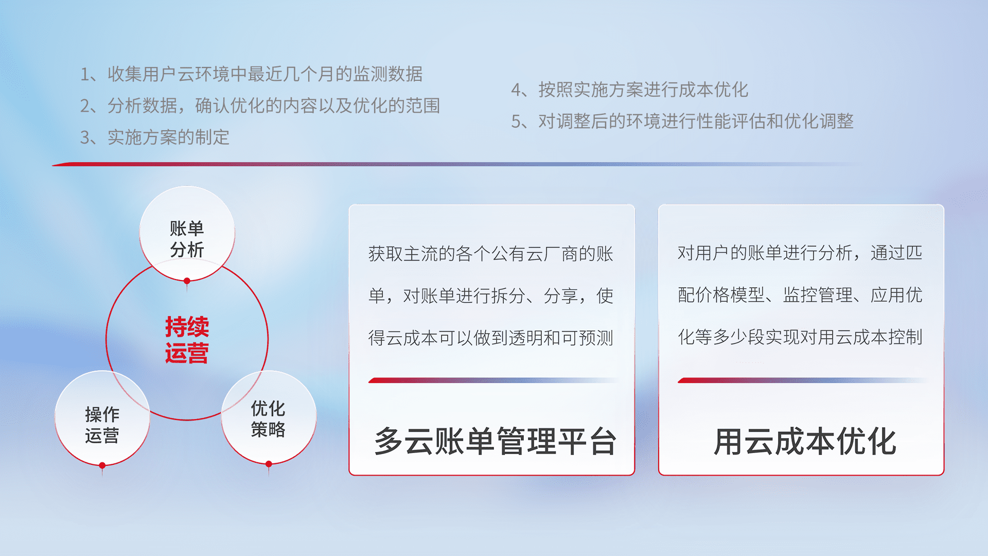 通过多云纳管,,以统一的资源数据模型把客户的云资源进行抽象和封装,,,,进而实现对多云资源的统一操作,,,,保障云资源管理的可靠性、、、、稳定性与可用性。。。。量身定制化运维内容,,配置、、、、开发运维、、、、补丁管理、、备份、、监控、、认证和访问管理、、、审计和日常巡检等,,,保障在用云过程中的可靠度,,,,稳定度以及高可用率。。。