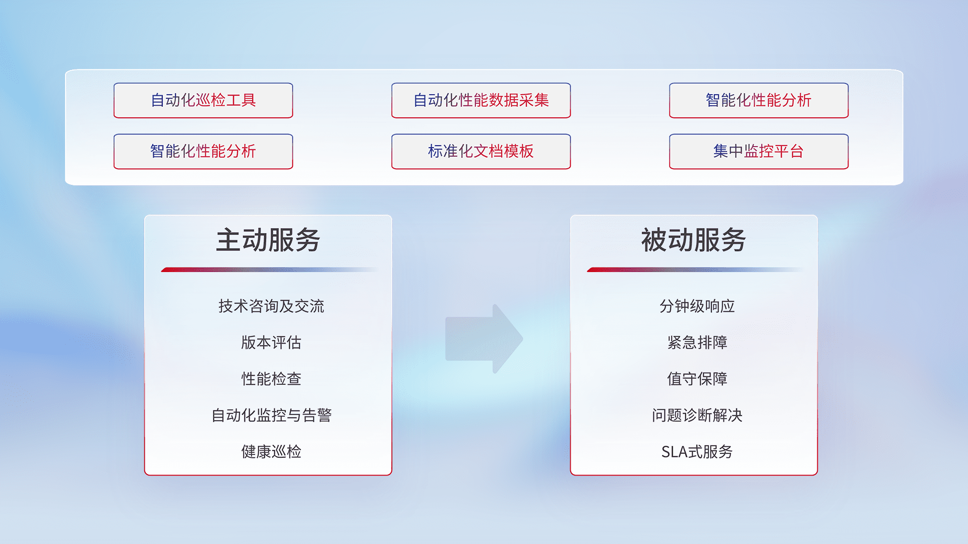 智能化工具和标准化文档,,,保障服务质量,,提供主动服务(包含技术咨询、、、、版本评估、、、性能检查、、、自动化监控与告警、、、、健康巡检)和被动服务包含(分钟级响应、、、紧急排障、、值守保障、、、、问题诊断解决、、、、SLA服务)。。。。