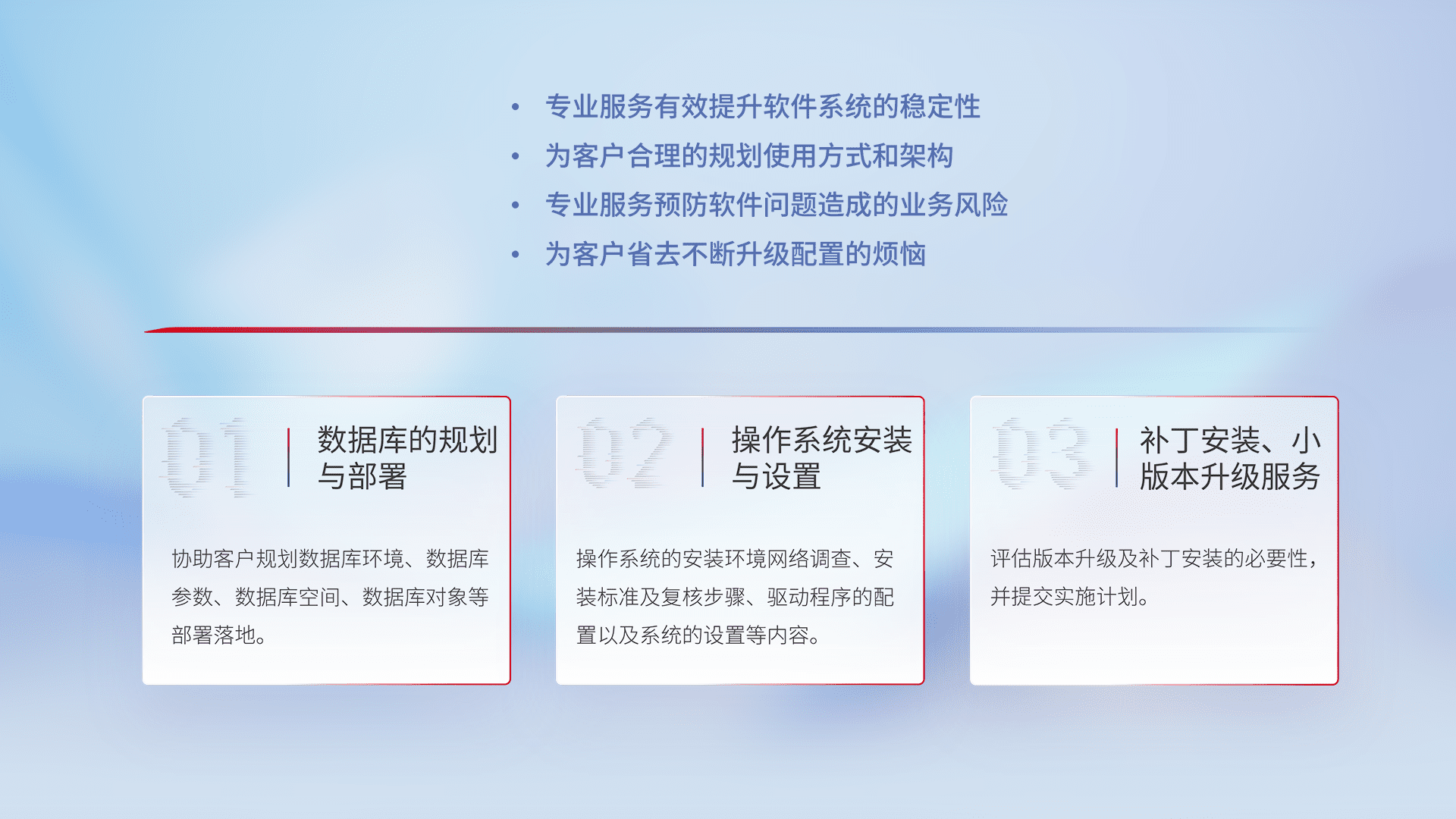 为客户提供软件规模升级、、、、快速部署、、按需配置的专业服务,,,从数据库的规划与部署到操作系统的安装与设置,,,,再到补丁安装和小版本升级提供支持。。