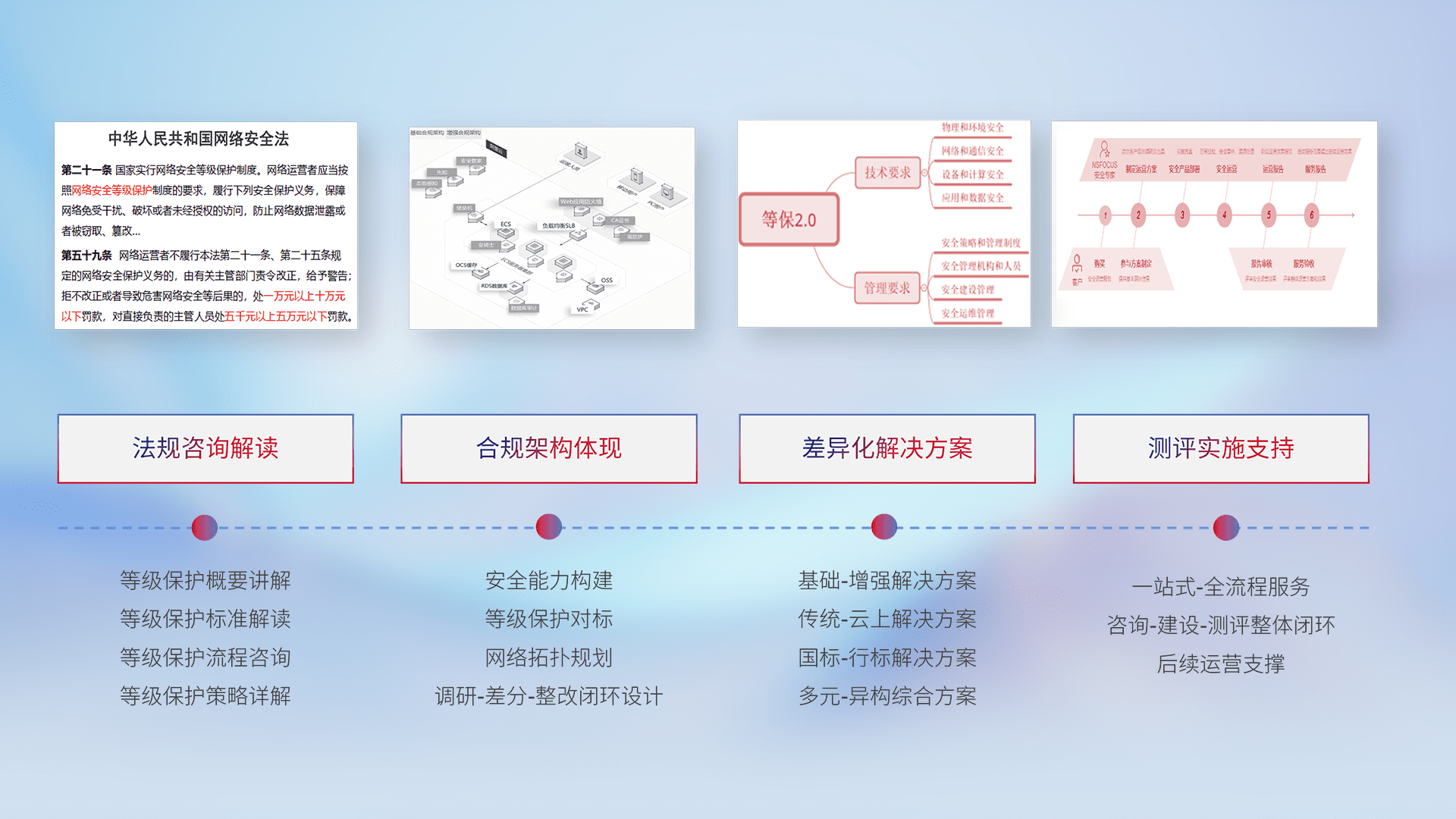 通过专业的法律咨询解读、、合规架构体现、、差异化解决方案、、、测试实施支持等服务,,为客户量身打造等保合规体系。。。